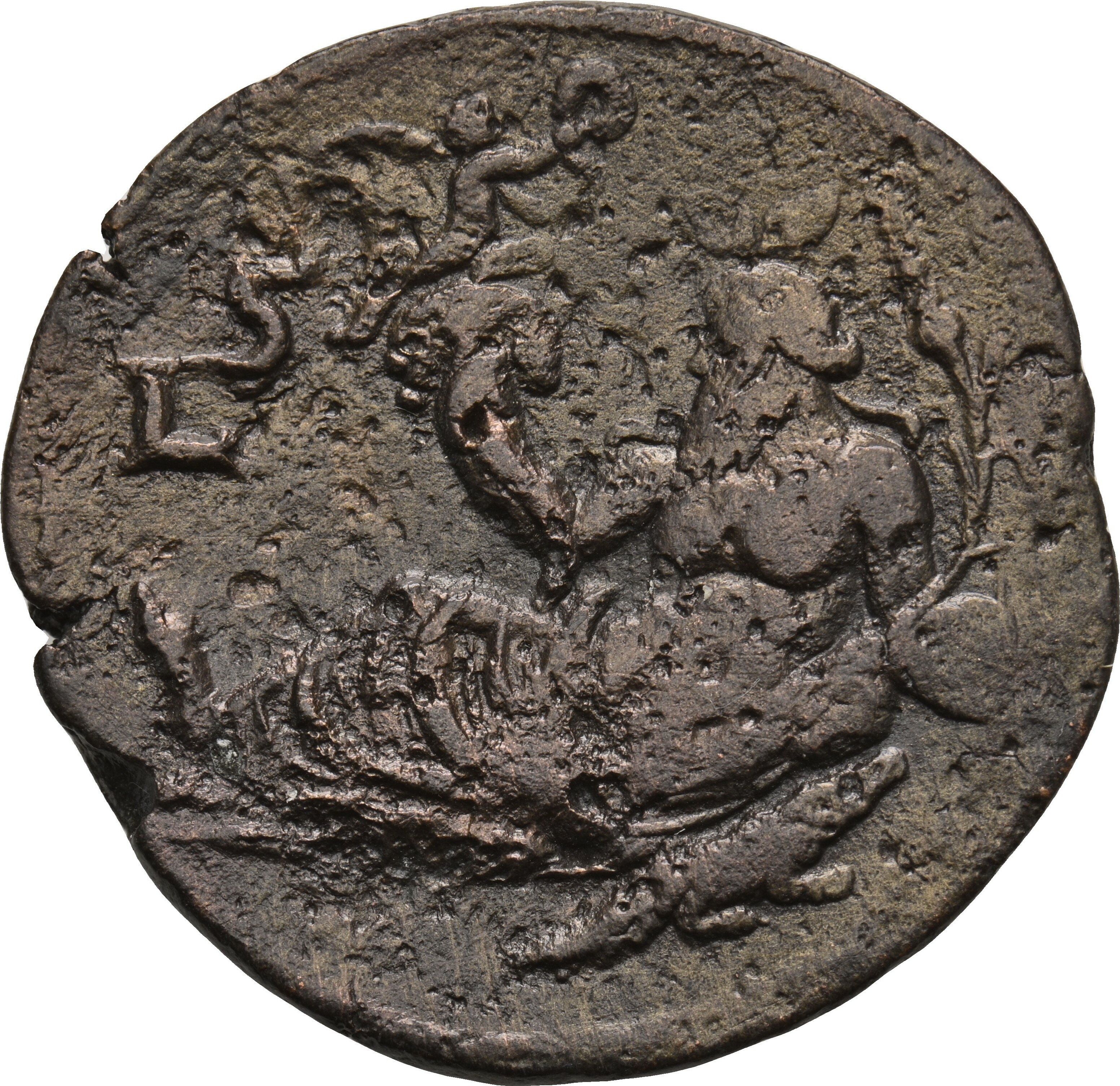 Nilus, with crocodile beside him, reclining left, holding cornucopia, (from which issues Genius holding (palm and) wreath), and reed