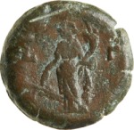 Tyche standing, facing, head, left, wearing kalathos, holding rudder and cornucopia