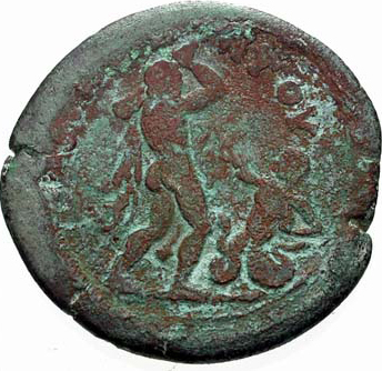 Heracles and the Hydra: Heracles advancing, right, lion skin around neck, seen from rear, raising club to strike Hydra on ground to right