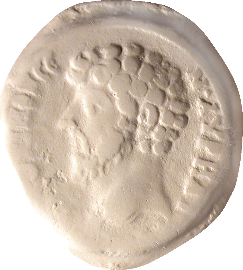 to left, Roma standing, facing, head, right, holding parazonium and holding up wreath; to right, emperor, laureate-headed, wearing toga, standing facing, head, left, holding small figure of Nike; at his feet, small male figure, wearing high cap, kneeling, right |