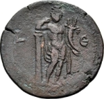 Harpocrates standing, facing, raising finger to lips, resting elbow on column, holding cornucopia