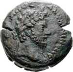 laureate head of Marcus Aurelius with traces of drapery, right