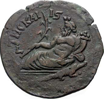 Nilus, with crocodile beside him, reclining left, holding reed and cornucopia; above, ΙϚ