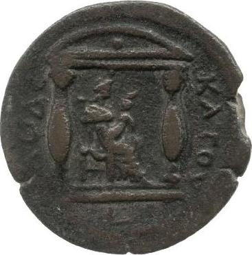 temple with two papyriform columns and rounded pediment enclosing statue of Isis seated, right, with Harpocrates, (before, hydreion on column)