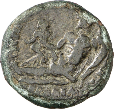 river-god (Maiandros) reclining, left, holding infant (Zeus) and cornucopia