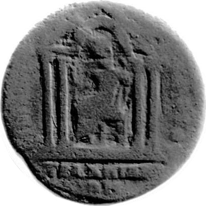 temple with four columns and rounded pediment enclosing statue of Zeus (Larasios) seated, left, holding Nike and long sceptre