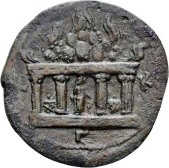 monumental altar or flat-roofed temple with four columns, architrave garlanded, barriers between outer pairs of columns, enclosing female figure dropping incense on altar; above, pyre; acroteria in form of aphlasta