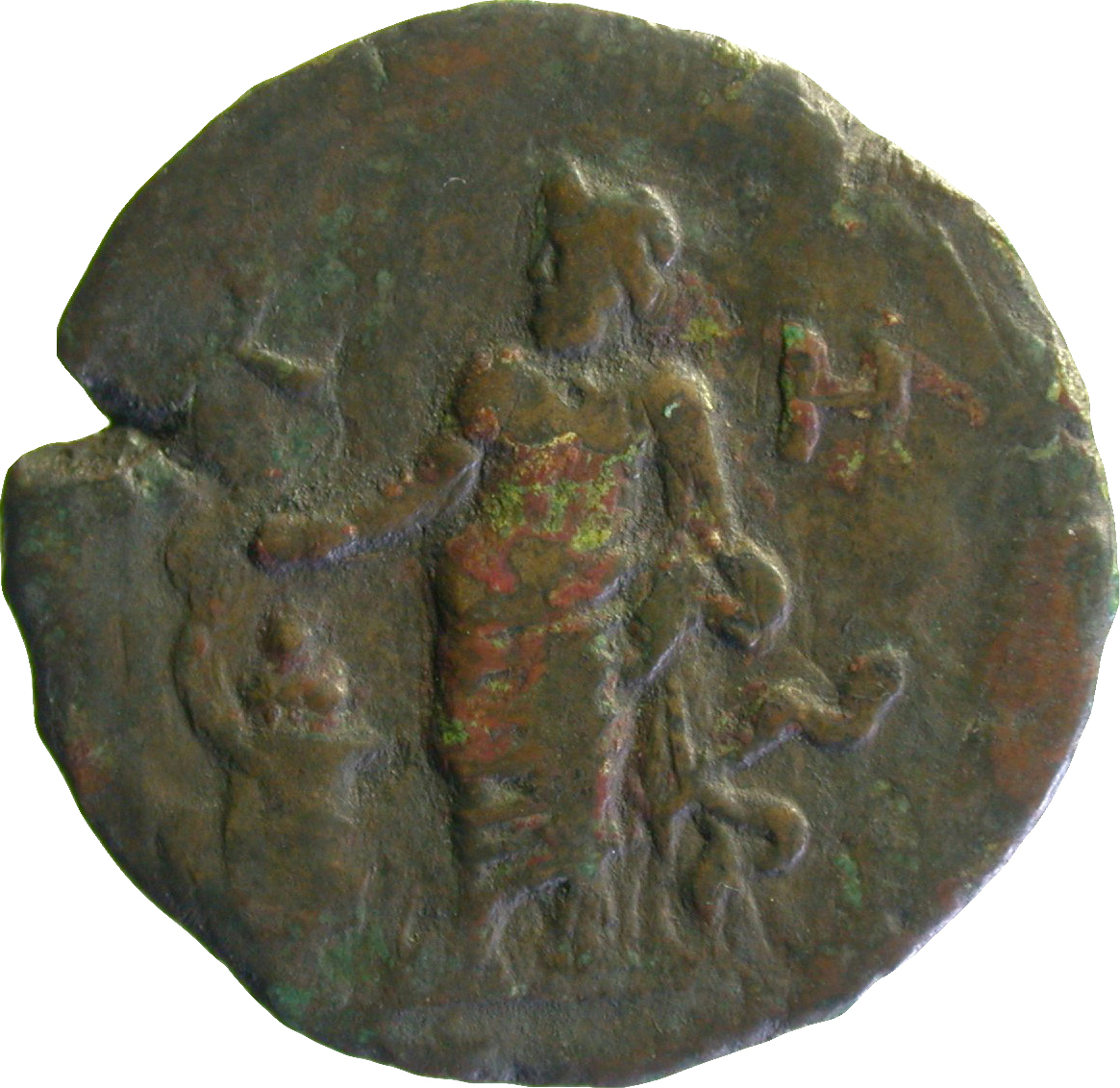 Asclepius standing, facing, head, left, holding patera over altar with serpent entwined around it, and holding serpent-staff