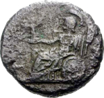 Roma seated, left, holding Nike and spear; beside throne, shield