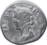 to left, Artemis standing, right, drawing arrow from quiver at shoulder, holding bow; to right, Apollo standing, facing, head, left, holding laurel-branch and chlamys