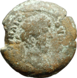 laureate head of Lucius Verus with traces of drapery, right