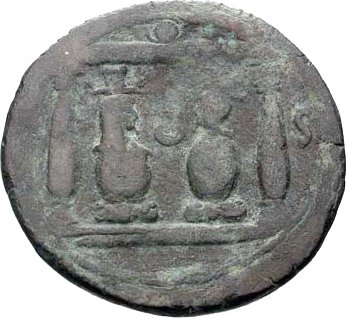 shrine (or temple) with two columns and rounded pediment enclosing two Canopi; between heads, crescent