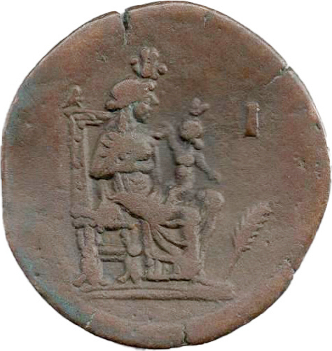 Isis, crowned, seated, right; on knee, Harpocrates, crowned with skhent, raising hand; on throne, hawk; before, palm-branch