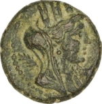 turreted, veiled and draped bust of Tyche, right; to left, palm-branch, to right, murex-shell(?)