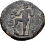 nude Poseidon standing with foot on rock, left, holding dolphin and trident