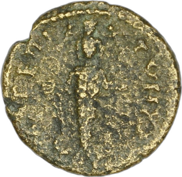 cult statue of turreted Artemis Leukophryene standing, facing, having supports, being crowned by two flying Nikai; between two standing eagles with spreading wings |