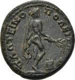 nude Apollo advancing, right, holding chlamys and laurel-branch over altar