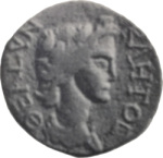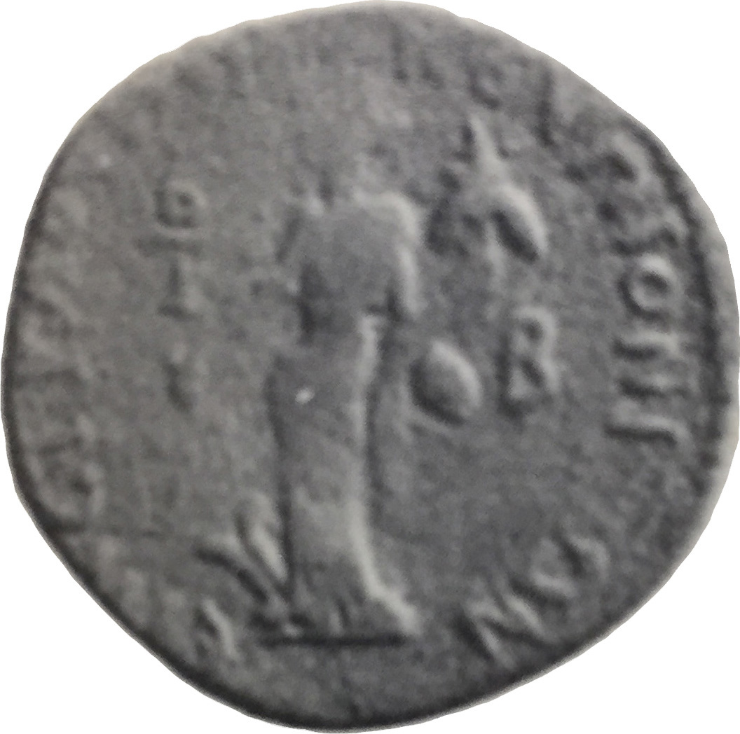 Tyche standing, left, wearing kalathos, holding rudder and cornucopia |