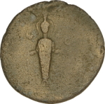 cult statue of Artemis of Ephesus standing, facing, wearing kalathos, having supports; between crescent (on left) and star (on right) |