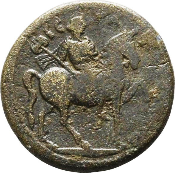 Apollo-Tyrimnaios on horseback, right, holding upright double axe