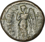 winged Nemesis standing, left, plucking chiton, holding bridle