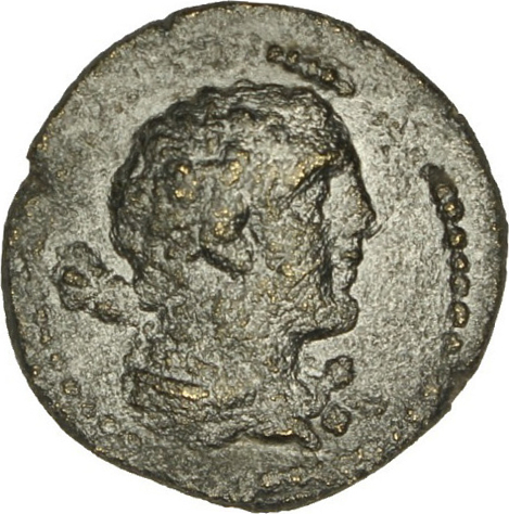 bust of Heracles (youthful) wearing lion skin around neck, right; over shoulder, club