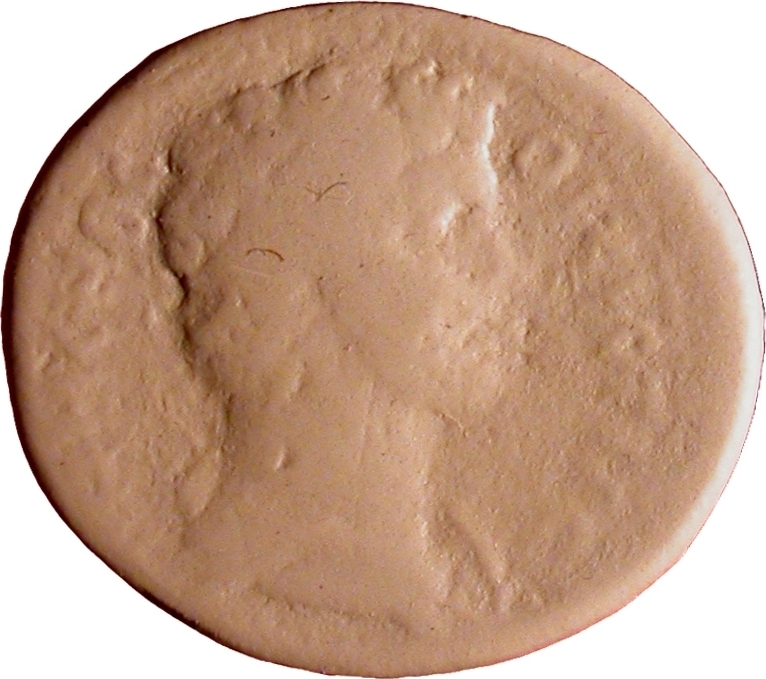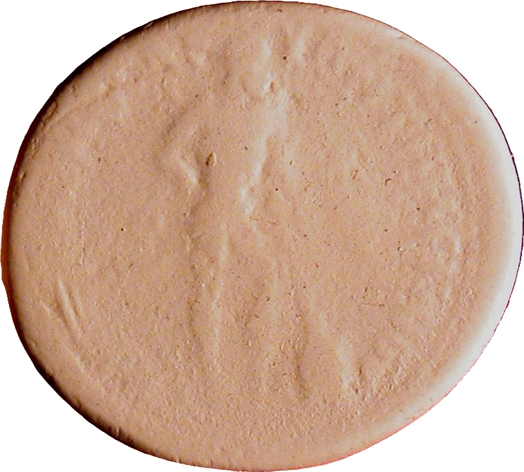 nude Heracles standing, right, resting arm on hip, holding lion skin(?), resting on club which stands on small base |