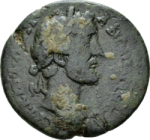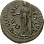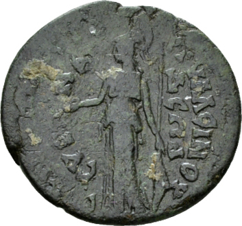Athena standing, left, holding patera, resting arm on shield; beside, spear |
