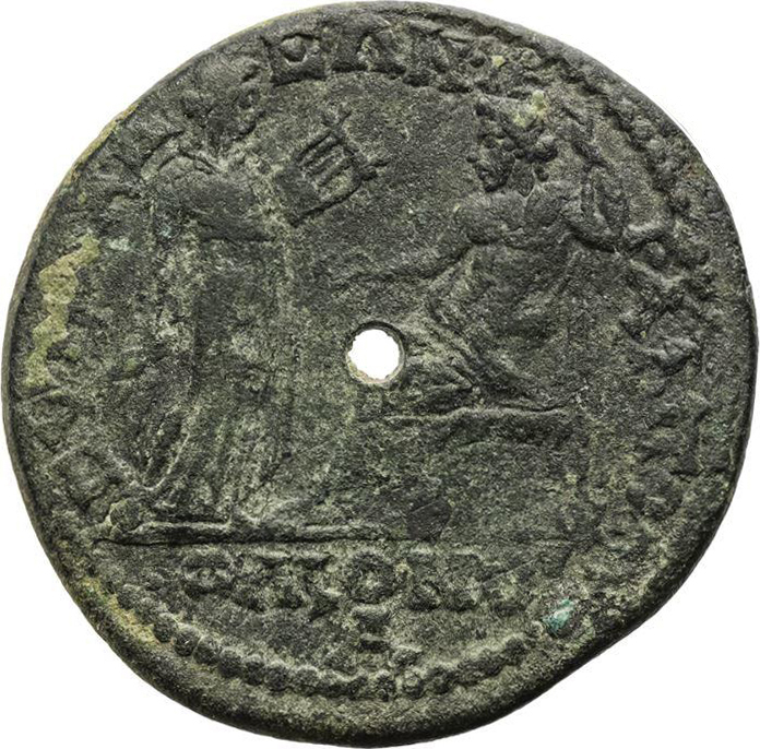 to left, Apollo standing, right, holding plectrum and lyre; to right, Zeus seated, left, holding patera and long sceptre
