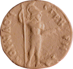 nude Ares(?) standing, facing, head, right, wearing helmet, holding spear and sword(?)
