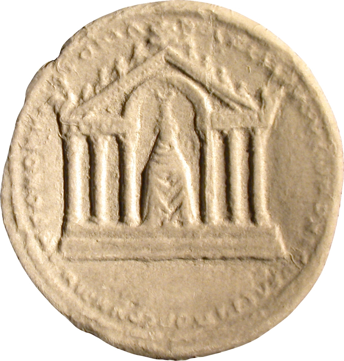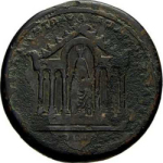 temple with six columns and rounded pediment enclosing statue of Kore of Sardis standing, facing, wearing tall crown surmounted by crescent
