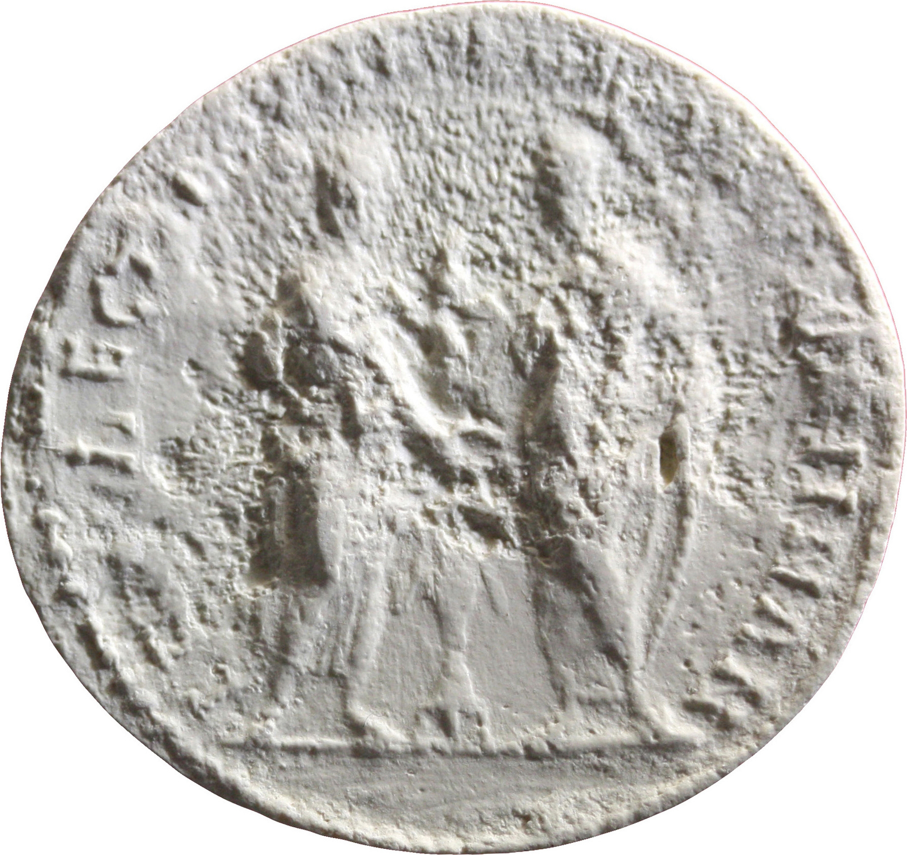 emperors (Marcus Aurelius and Lucius Verus) standing, facing each other, clasping hands over tripod, each wearing toga |