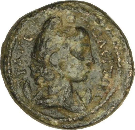 draped bust of Mên wearing laureate Phrygian cap, right; behind his shoulders, crescent