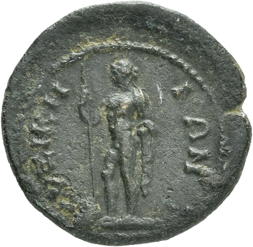 nude hero (Kyzikos) standing, left, chlamys over shoulder, holding spear