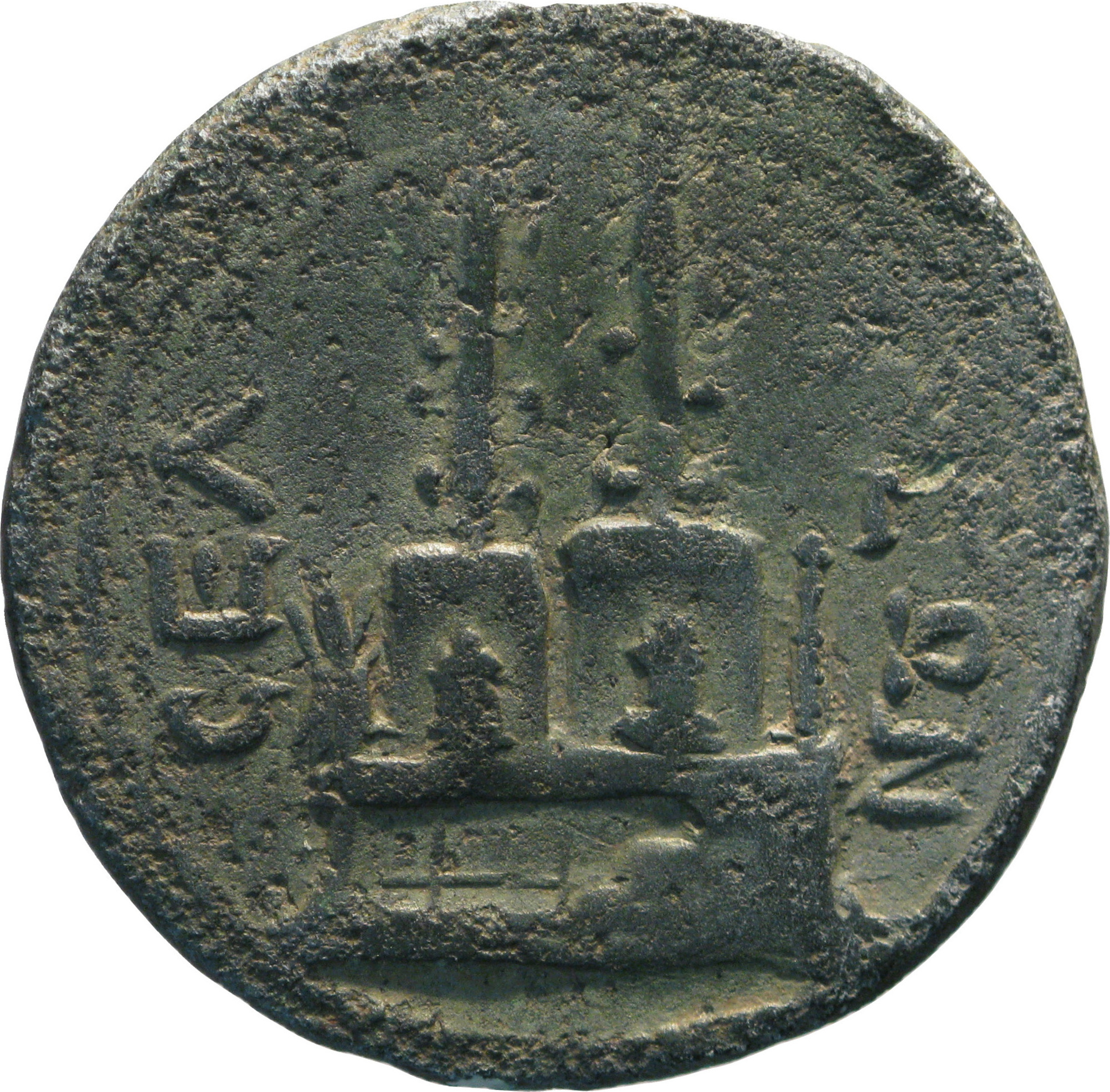 sanctuary of Zeus and Heracles: two sacred trees in enclosures between thunderbolt (on left) and club (on right); before each tree, altar; all on base