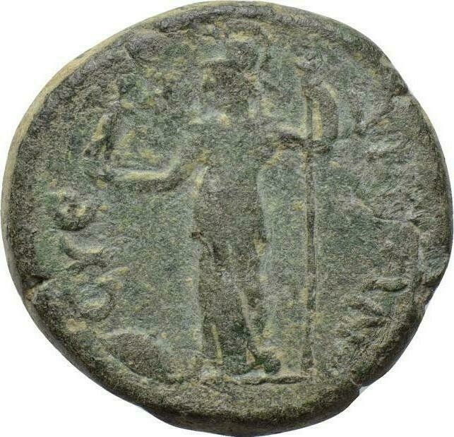 Athena standing, facing, head, left, holding Nike and spear; at feet, shield