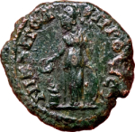 Athena standing facing, head left, holding patera over flaming altar, resting left arm on shield