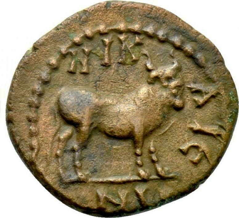 Apis-bull standing, right, wearing uraeus headdress; between horns, sun disk