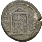 temple with two columns including statue of Artemis of Perge between two animals on columns