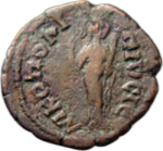 Demeter standing facing, head left, holding ears of corn in her raised right hand and torch in her left