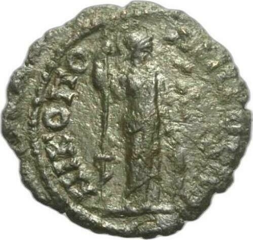 Athena standing facing, head right, resting on spear with entwisted serpent with her right hand, her left resting on shield set on ground
