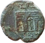 Triumphal arch surmounted by quadriga; in central opening, legionary standard; in side openings, perhaps also standards (?)