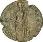 Athena standing, facing, head, left, holding patera, resting arm on shield; beside, spear