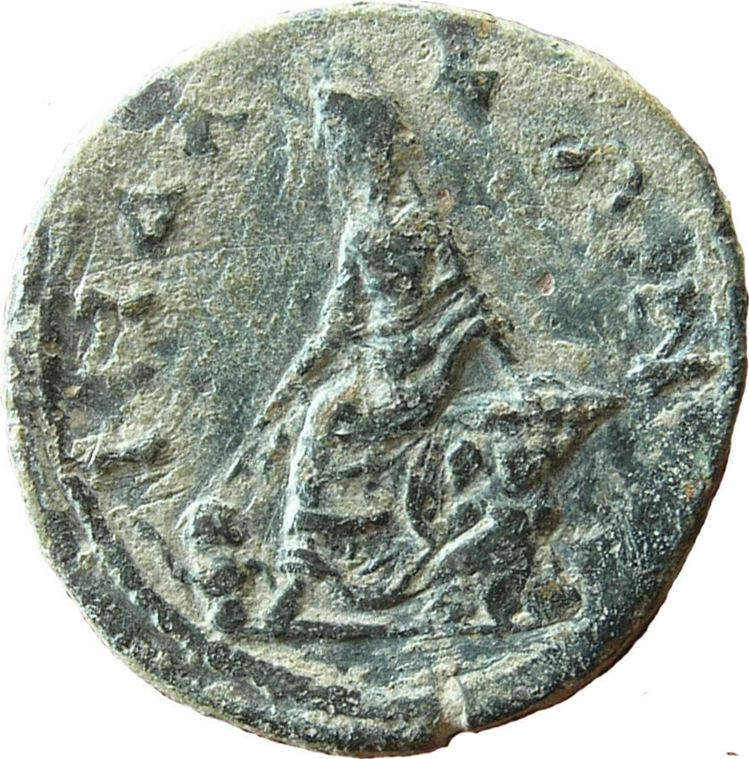 turreted Tyche seated on rock, left, holding ears of corn, resting arm on rock, resting foot on swimming river-god (Tembris)
