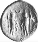 Dioscuri standing, facing, heads turned towards each other, each wearing pileus surmounted by star and holding sword and spear; between them above, crescent