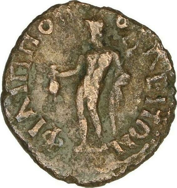 nude Hermes standing, left, holding purse, caduceus and chlamys