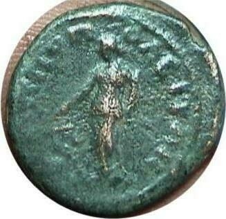 Nemesis standing left, holding scales and cubit rule(, wheel at foot?)