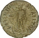Apollo standing, left, nude, holding patera over altar and uncertain object (bow & arrow?); at shoulder, chlamys