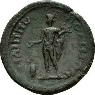 nude Apollo, standing facing, head left, holding patera over altar and branch, chlamys over left arm