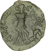 maiden advancing, right, wearing kalathos, brandishing spear; holding bow; to right, stag standing, right